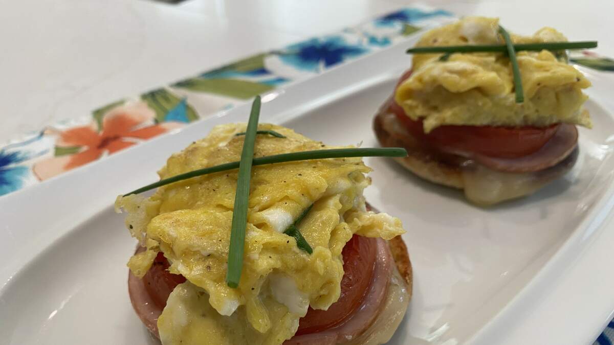 In a non-stick pan warm the Canadian bacon on medium heat, don’t overcook. Take bacon out of pan and set aside. Add butter to pan, let it melt. Scramble the eggs, season with a little salt and pepper. Add the eggs to the pan and cook using a plastic spatula to fold over. During the last part of cooking the eggs fold in the chives.